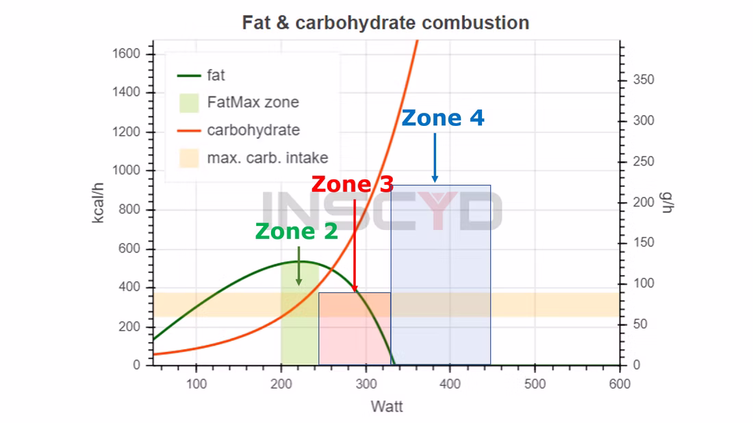 Az edzés intenzitása. A vérből származó zsírsavak és az intramuszkuláris zsírok oxidációja alacsony és moderált intenzitásokon magas, de az intenzitás emelkedésével egyre csökken és a glikolízis kerül előtérbe. A zsíroxidáció maximuma (FatMax) a Vo2max körülbelül 60-65 százaléka, de ez nagyon egyedi érték. Edzett sportolóknál a FatMax és az LT1 intenzitás megegyezik, utóbbi esetleg egy kicsit lehet magasabb, kevésé edzett sportolóknál azonban bőven az LT1 alatti intenzitáson van a zsíranyagcsere maximuma. Az alacsony intenzitású edzés fontosságához éppen ezért sem fér kétség, akár haladó, akár kezdő sportolóról van szó.
